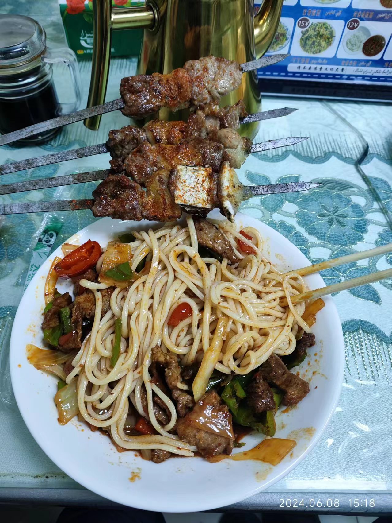 老地方羊肉汤烤肉的过油肉拌面简直是人间美味,再来三串羊肉串,可以回味一生。